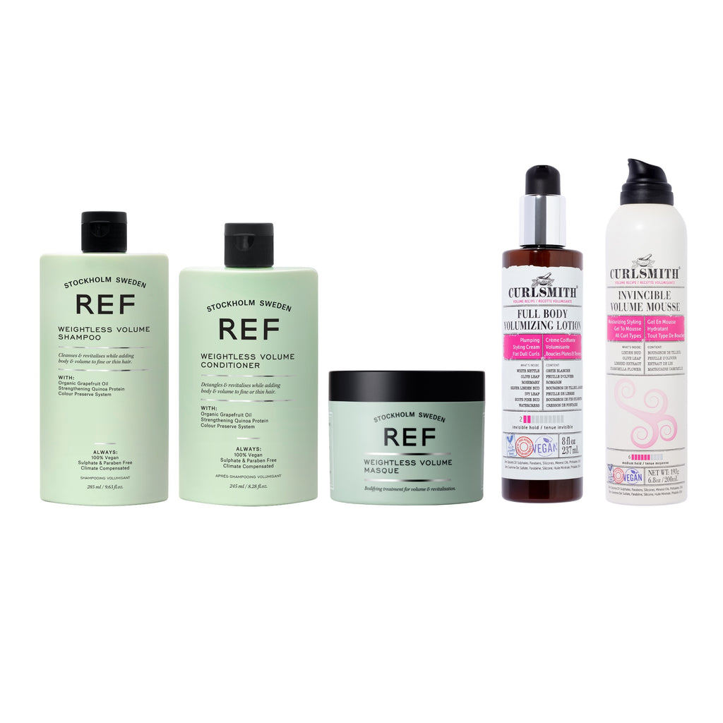 De basis van volume begint onder de douche. De REF Weightless Volume Shampoo, Conditioner en het Masker reinigen je haar op een milde manier en geven tegelijkertijd extra body aan je krullen.